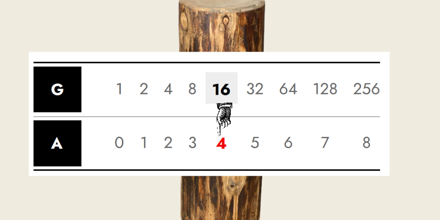 | G | 1 | 2 | 4 | 8 | 16 | 32 | 64 | 128 | 256 |